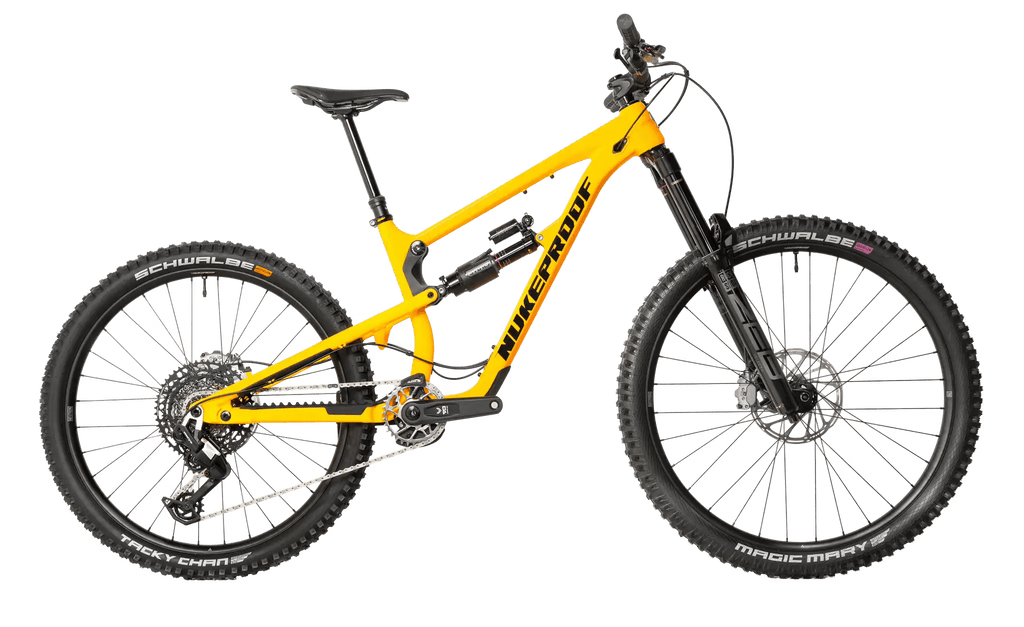 - Nukeproof Mega V4 290 Alloy, Nukeproof Yellow, 160mm Travel, custom triple butted hydro-formed tube set, internal cable routing, ISCG 05 mount, Enduro Bearings, Threaded 73mm BB, Boost 148mm rear axle spacing, 3D contoured Rubber frame protection.